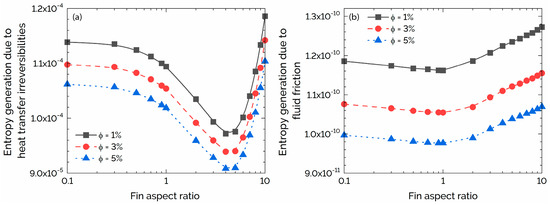 Based on Figure 9a, entropy generation caused by heat transfer irreversibility is high at low aspect ratios, then decreases as the aspect ratio increases until about AR = 4 when after that point it starts to dominate again. The lowest entropy generation caused by heat transfer irreversibility value exists for AR ≅ 4. The contribution of the different concentrations of CuO also has a significant impact. The line of 1% CuO concentration has shown the higher values of entropy generation, while as the concentration increases, the entropy generation caused by heat transfer irreversibility decreases. The present simulations are performed for several Rayleigh numbers, however, the results showed that there is not any difference to be noted, apart from a not easily detected point at which the natural convection of the flow becomes forced. That transition point is spotted in all three cases at the aspect ratio of about 0.5 and for Ra ≅ 5 × 106, although the results for this task are not so satisfying to plot. On the other hand, Figure 9b depicts the effects of the different fin aspect ratios on entropy generation caused by fluid friction. Figure 9b depicts that entropy generation caused by fluid friction is low for the lower aspect ratios, as the entropy generation caused by heat transfer irreversibility is dominant for these aspect ratios. However, it is clear that after AR ≅ 1, the entropy is generated more owing to fluid friction. After that point and up until the highest AR, the trend is kept high without showing signs of getting lower. The effects of the various concentrations are also noticeable. As someone would expect after seeing Figure 9, the fluid friction decreases when the concentration increases. The scientific explanation of this is that all the thermal properties, for example, thermal conductivity, thermal expansion coefficient, and viscosity of the fluid are enhanced; hence, this makes it less frictional between the particles. When comparing these two graphs, one can observe that when AR is around 2, the entropy generations caused by heat transfer irreversibility and fluid friction are balanced, whereas in other cases, only one of them can be considered dominant depending on the geometry of the fin.