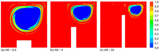 It is worthwhile to have a look at Figure 10, which includes total entropy generation and Bejan number plots concerning the fin’s aspect ratios. The total entropy is generated mainly caused by heat transfer irreversibility, as it is several orders higher than the other. Moreover, the trend shows that it is kept higher at the lowest and the highest aspect ratios, while it decreases as the AR approaches the value of 4. Furthermore, the Bejan number is investigated in detail in Figure 10b. The results are obtained after the integration of local Bejan numbers based on the same parametric values of Ra and Re as previously stated. As the aspect ratio of the fin increases, the Bejan number (Be) increases as well. The rise of Be number is starting linearly. The Be number is the ratio of entropy generation caused by heat transfer irreversibility to the total entropy generation, which means that the higher the fraction is, the less influence the fluid friction forces have. Figure 10b also indicates that since Be >> 0.5 for all the fin aspect ratios and concentrations, the irreversibility caused by heat transfer is dominant in the nanofluid flow. In addition, the higher concentration of CuO results in higher Be number values. Finally, Figure 11 consists of three contours of Be numbers, which depicts an excellent justification supporting the previous graphs, and Figure 10 regarding the trend of Be numbers. Here, the produced contours for aspect ratios of 0.5, 4, and 10 allow us to notice that as the aspect ratio increases, the Be number tends to become 1. This verifies once again what is already stated, with the increase in AR, the entropy generation caused by fluid friction decreases significantly and the entropy generation caused by heat transfer irreversibility becomes increasingly intense and influential.