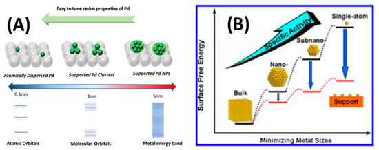 (A) Pd species with different size (single atom, clusters, and nanoparticles) supported on metal oxide matrix, and the electronic structure on different species is also presented (B); schematic illustration of the surface free energy vs. supported Pd species size.