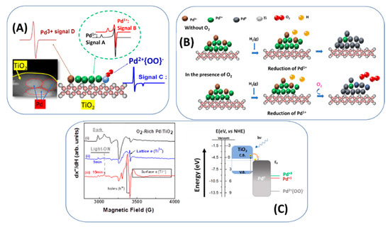 (A) Schematic depiction of structural assignment of the detected Pdn+ species. (B) Proposed mechanism of formation of {Pd2+-O2−} species (C) Schematic photoinduced electron transfer mechanism under photocatalytic conditions. (i–iii) materials with different treatment. Adapted from [25] with permission.