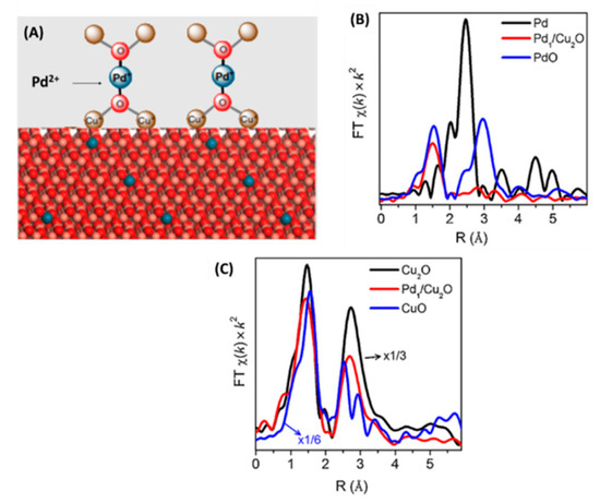 (A) state and coordination environment of Pd atomically dispersed on Cu2O surface. (B) a FT EXAFS of different Pd species (C) a FT EXAFS of different Cu species. Adapted from [26] with permission.