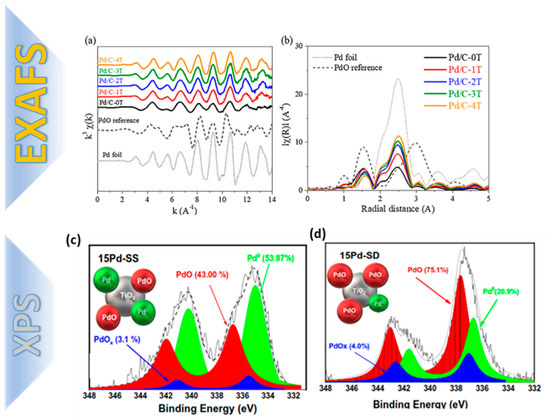 X-ray photoelectron spectroscopy (XPS) can also detect the oxidation states, chemical environments, and bonding information of the Pd centers and its surrounding heteroatoms (e.g., such as N,S,O) [32,33]. In our recent work [25], we have used XPS as a diagnosis tool for controlled formation of PdO states, i.e., up to 75% of total Pd content of Pd/TiO2 nano catalysts [25] by flame spray pyrolysis technology.