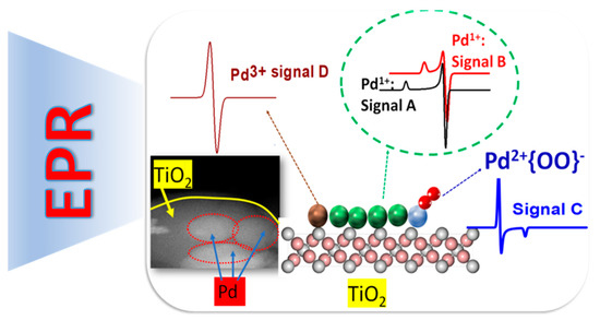 The most common, stable oxidation state Pd2+(S = 0) is EPR silent. So far, most EPR studies of Pd on particles and materials referred to Pd incorporated in zeolites as a host matrix [34,35,36,37,38,39,40,41,42,43]. In these works, Pd1+, and Pd3+ states were stabilized due to the interaction with the zeolite matrix. Additionally, zeolites have been shown to promote interaction of O2 with Pd1+, resulting in stabilization of unconventional Pd2+-O2− or Pd2+-O33− states [43]. Recently, we have demonstrated that EPR offers a versatile, sensitive tool to distinguish and quantify Pd1+, Pd3+ species formed at the interface with TiO2 particles [25], see Figure 11. Moreover, we have shown that EPR allows detection on non-conventional {Pd2+-OO−} species [25]. Such spectroscopic data can be rationalized by combination with theoretical calculations, i.e., such as density functional theory (DFT) calculations [7].