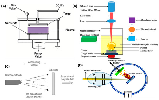(A) Schematic illustration of DC–magnetron sputtering system. (B) Experimental setup of laser ablation technique. (C) Ion Beam Deposition technique. (D) electron beam evaporation. Adapted from [59] with permission.