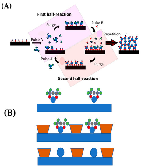 (A) Schematic representation of the ALD technique using a binary (A,B) precursor system. (B) Exposure to a first precursor vapor. Adapted from [57] with permission.
