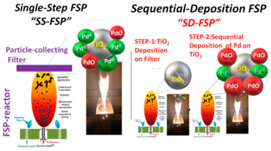 Flame spray pyrolysis (FSP): FSP is a gas-phase combustion technology [18] where the metal ions are forming particles via a droplet-to-particle process that occurs at high temperatures, 2000–3000 K [18]. The deposition of {Pdn+-X} species can be accomplished by use of the so-called single-nozzle FSP or the double-nozzle-FSP [17]. In these FSP-based methods, Pd dispersion, e.g., over metal-oxide such as TiO2, is controlled via the Pd concentration in the Pd precursor, or via the flame properties, e.g., allowing more diffuse flames [17]. Recently, we have presented the concept of sequential-deposition FSP (SD-FSP), where the Pd is deposited on the metal-oxide support in a second step, after the formation of the metal oxide [17,25], see Figure 14.