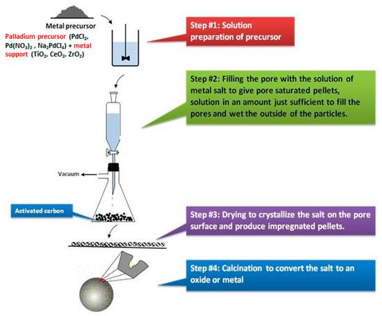 For example, hydrazine in water (strong reducing agent), compared to methanol (weak reducing agent) results in higher supersaturation, thus bigger Pd-NPs (12.1 nm) were grown [75,76,77,78,79,80,81]. Differently stated, this method disfavors the formation of atomic {Pd-X} species. To conduct a dry reduction, the Pd2+-loaded metal oxides were isolated from the precursor solution, purified, freeze-dried, or calcined, and then reduced without the addition of a solvent, for example, under a hydrogen gas flow. This is the so called “wetness impregnation”, see Figure 16, where the catalyst is impregnated with an aqueous or organic metal salt solution, with the metal salt strongly absorbed to the support surface. The leftover solvent is evaporated to produce the salt-impregnated catalyst. The impregnation procedure is highly dependent on the surface’s adsorption ability for organometallic complexes or inorganic salts, with the metal salt–support interaction to be crucial and considerably affecting the quantity of metal loading and the metal’s dispersion on the support surface. The essential criteria for regulating metal dispersion are: (i) the type and concentration of the metal salt, (ii) the pH value of the aqueous solution, and (iii) the kind of catalyst support and the surface functional groups. In this context, Kim et al. have used the wetness impregnation to create {Pdn+-X} species supported on C@gC3N4, used for electrochemical reactions [80].