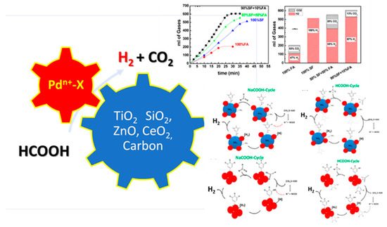 More specifically, in 2016, our group [83] had demonstrated that the ternary nanohybrid [Pd/SiO2-Gallic acid], i.e., combining [metal] with [oxide support] with [organic cofactor], achieves a high H2 production 19 mL min−1(Ea = 42.2 kJmol−1), see Table 1. Recently, H2 production by dehydrogenation of aqueous ammonium formate at a rate of ~10 mL min−1, at RT, was achieved by TiO2-supported Pd nanoparticles Ea = 37 kJ mol−1. Highly efficient FA dehydrogenation at RT was also reported in 2017 by Akbayrak et al. [23] for a Pd/CeO2 nanocatalyst achieving 10 mL H2 min−1. All these studies dictate that the efficiency of H2 production by FA decomposition can be decisively affected by the intrinsic electronic and structural properties of the Palladium on the surface such as composition, size, dispersion, and oxidation state.
