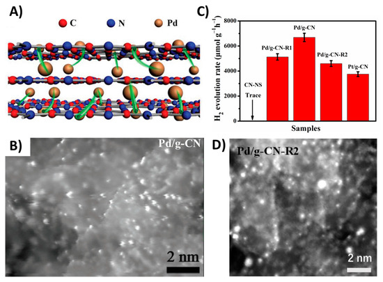 - Liu, L.; Wu, X.; Wang, L.; Xu, X.; Gan, L.; Si, Z.; Li, J.; Zhang, Q.; Liu, Y.; Zhao, Y.; et al. Atomic palladium on graphitic carbon nitride as a hydrogen evolution catalyst under visible light irradiation. Commun. Chem. 2019, 2, 2–9. [Google Scholar] [CrossRef]