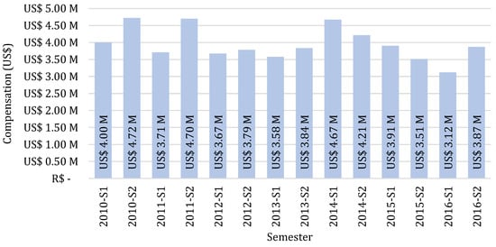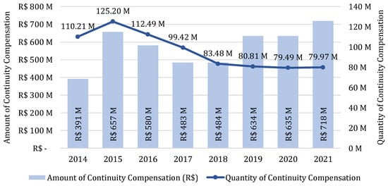 The model linked to the definition of continuity indicators and limits for the quality of electricity in the Brazilian context is based on studies comparing the performance of energy distributors to defined goals [25,26]. Currently, the indicators and their limits are established by the methodology presented in Technical Note N°102/2014, which was presented at the ANEEL Public Hearing N°29/2014 [27]. The limits are considered for monthly, quarterly, and annual periods, which, if violated, imply the payment of financial compensation to the consumer units, by the utilities, and the calculation of the compensations is defined in module 8 of PRODIST [24].