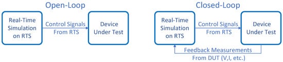 HIL testing in power system applications interfaces real-time power system simulations to actual hardware devices enabling high fidelity open-loop and closed-loop testing (Figure 2) in a lab environment prior to deployment on the grid [56,57]. In the open-loop configuration in Figure 2 the signals from the power system simulation are sent to the DUT, but there is no feedback from the DUT to influence the power system simulation. In closed-loop testing, feedback from the DUT influences the power system simulation which in turn impacts the DUT. Closed-loop operation is the most comprehensive testing of interoperability, control algorithm stability and handling of grid faults and transients which require direct feedback of the DUT to the grid [54,56,57]. As indicated in this paper’s introduction, two different and complementary HIL configurations exist including controller hardware-in-the-loop (CHIL) and power hardware-in-the-loop (PHIL) [6,11,12], which will be further detailed in the following sub-sections.
