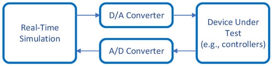HIL real-time simulations have historically been used in the automotive, aeronautics, space, defense, and utility industries [8]. The automotive industry has been applying the strengths of HIL simulations for decades in testing and validating complex software systems on specially designed test benches that receive data inputs from DUTs, e.g., for the development of electronic control units (ECUs) applied to antilock brake and traction control systems [6,9]. The aerospace industry has also implemented HIL simulations extensively, e.g., in the development of flight simulators to train pilots on cockpit hardware while avoiding the risks associated with flying [6,10]. In addition, factory acceptance tests are commonly run with a HIL RTS to ensure the user can replicate field behavior [8]. It is important to note that an RTS is often referred to as a digital real-time simulator (DRTS), similar to the name of a common RTS vendor (RTDS Technologies).