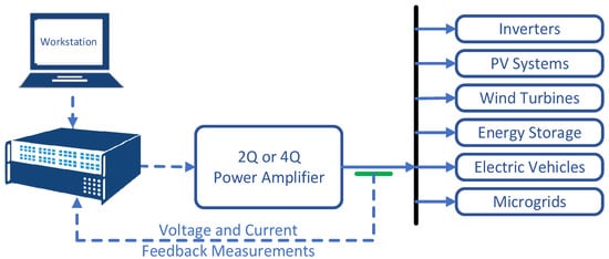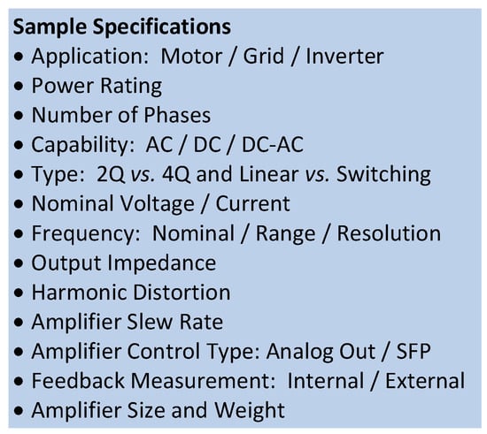 The power amplifier selection is technical, with sample specifications shown at the top of Figure 8, with the foundational specification being the overall application type [56]. Other important aspects of the specifications are the power rating, the number of phases, what type of capabilities are needed for the simulation, e.g., AC or DC, or DC to AC etc. Also important is whether a two quadrant (2Q) or four quadrant (4Q) amplifier is necessary as shown in the middle of Figure 8. 2Q amplifiers can only source (generate) power to the DUT whereas 4Q amplifiers can operate in all four quadrants of the power plane and thus can both source and sink active and reactive power. For closed-loop PHIL simulations, the amplifier is required to operate in all four quadrants of the power plane [56,57]. When 2Q amplifiers are employed, depending on the application, they may require additional sinks/loads between the amplifier and the inverter because the DUT (e.g., PV inverter) power would need to go somewhere and the amplifier cannot sink the power [56,57]. Overall, the 4Q power amplifier acts like a grid simulator and reproduces/amplifies the voltages on the real-time simulated network and interfaces/absorbs power from devices. Another critical detail is that some amplifiers are designed to absorb 100% of their rated power when operating in sink mode but some cannot, so one must be careful when specifying the amplifier, e.g., the amplifier must have the capability to feed the device under test and to absorb the full power generated by the device [56].