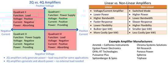 Other specifications included on the left side of Figure 8 are self-explanatory, though of importance to mention is that the power amplifier slew rate is how fast the amplifier responds when a set point is sent to the amplifier [56]. As shown in the upper right of Figure 8, amplifiers used in PHIL applications have been linear and non-linear (switched) types with the characteristics of each listed [56]. Currently, non-linear switched amplifiers are predominantly implemented due to the fact that they are more efficient with higher power densities and can be more easily connected in higher power applications [56]. Example amplifier manufactures are given in the lower right of Figure 8.