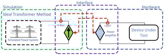 The ITM works on voltage (or current) amplification and current (or voltage) feedback [57]. In this methodology, the RTS sends the voltage/current to the amplifier immediately (or as soon as possible) after the voltage/current is computed and initiates the current/voltage read just before it is needed for the EMT algorithm used in the simulator’s network solution [57]. Therefore, the delay is not simply one simulation time step, but also must include any communication delays, power amplifier response characteristics and transducer characteristics, which also includes filters [57,112]. For example, as shown with the red dashed lines in Figure 9, the simulator will use the ITM to create the voltage signal for the amplifier which then presents as a voltage source for the DUT (e.g., a grid-following PV inverter) and then the inverter current measured by the amplifier is fed back to the simulated grid model to close the loop [57].
