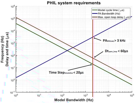 Figure 11 below graphically depicts Equations (2)–(4) and illustrates an example of the characteristics needed to test a grid transient whose maximum frequency of interest is 2 kHz [52,107]. According to Equation (3), the minimum bandwidth of the power amplifier (“PA bandwidth” in Figure 11) is 3 kHz. Per Equation (4) the time step must be less than 20 µs, and according to Equations (1) and (2) the maximum open-loop delay must be less than 60 µs. These requirements are met for characteristics to the right of the red line in Figure 11.