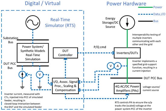 PHIL allows actual power hardware, including their embedded controllers, to be tested at rated power using power amplifiers correlating to the conditions in the electrical system simulation running on an RTS [6,7,8,11,12,17,18,19,20,21,22]. PHIL offers strategic testing capabilities for a wide variety of applications including power system grid and microgrid applications, aerospace, automotive drive train, electrified transportation and charging station infrastructures [8]. Significant PHIL application benefits have been identified in the power systems area where the interaction of DUTs with the grid can be tested in a realistic and controlled environment including microgrid controllers along with actual power electronic converters used in PV, wind, battery energy storage and EV charging equipment [23,24]. The simulated system running on the RTS is a simulated power system, e.g., which could be a small or multi-thousand-node distribution feeder, and the simulation could include models of DERs and their inverters and loads interfacing with actual hardware DER inverters [7]. It is important to note that it is difficult for DER models to accurately replicate the complexities of real devices like nonidealities and vendor specific behaviors [7], further emphasizing the need and benefits of PHIL for high fidelity testing.