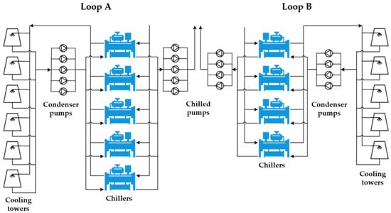 Figure 1 depicts the system diagram of a water-cooled chiller system, which is used to supply chilled water to the air conditioning system. The chiller system consists of nine chillers, nine condenser pumps, nine chilled pumps, and eleven cooling towers distributed in two separate loops (Loop A and Loop B). The monitoring of system operating data is uniformly performed for both loops. When calibrating the chiller plant simulation system, it is common practice to individually calibrate the equipment in the system. As the main components of the chiller plant, the chillers consume about 35–40% of the energy consumption of the air conditioning system [28,29]. Therefore, the chillers are selected as the study object to introduce the calibration method.