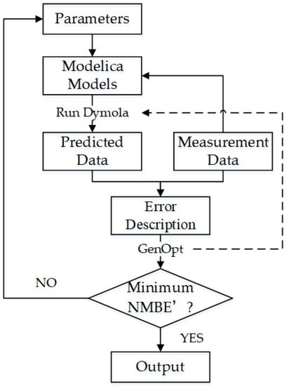 Figure 2 describes a general procedure of optimization-based calibration, which was adapted from Fu et al. [11]. This stage aims to match the simulation results with the observed outputs by adjusting the calibration parameters. We used the GenOpt [33] optimization engine and employed particle swarm optimization (PSO) to complete the calibration parameters update. Normalized mean bias error (NMBE) can be used as an indicator of all biases in the simulation predictions, which can be expressed by Equation (5). However, NMBE suffers from cancellation between positive and negative bias, which can lead to misleading interpretations of predictive performance [34]. To avoid this problem, we improved the calculation method of NMBE, recorded as NMBE’ (Equation (6)).