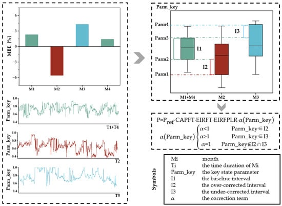 In Figure 3, the flow chart of error-based reverse correction is presented in an easy-to-understand manner. After completing the optimization-based calibration based on the monthly measured data of chillers energy consumption, the hourly simulated data of performance-related state parameters and the monthly simulated data of chillers energy consumption can be obtained. The mean bias error (MBE) was used to calculate the error between the simulation and reality, determining the degree of proximity for each month. The formula is as follows: