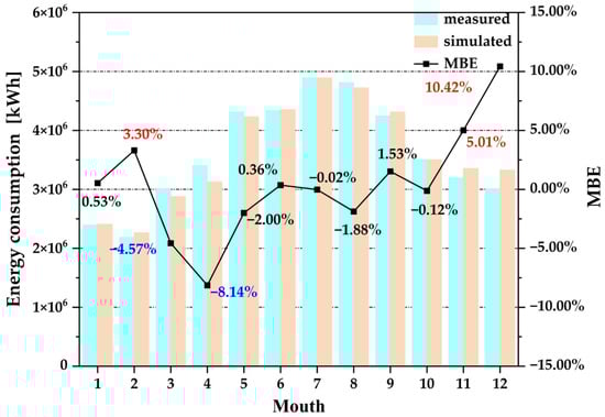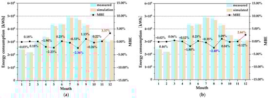 Figure 5 shows the monthly measured and simulated chiller energy consumption. After completing the optimization-based calibration, the accuracy of chiller energy consumption significantly varied from month to month. The monthly MBE reached −8.14% in April and 10.42% in December. The prediction accuracy of the calibrated model was not satisfactory.