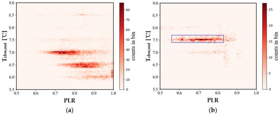 Figure 7 shows the distribution of key state parameters for the chillers in Loop A in the baseline dataset and in April. In the dot-density map, the darker the color, the more chiller operating points are distributed. It is obvious that the two were different, and the operating conditions of the chillers in April were concentrated in the blue rectangle: