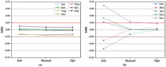 As can be seen in Figure 9a, the MBE values for the same month belonging to the baseline dataset were almost unchanged in the three schemes. In addition, the MBE values in the over-corrected dataset and the under-corrected dataset were significantly reduced by the error-based reverse correction, as shown in Figure 9b. After optimizing the original model by adding correction terms, this did not affect the prediction accuracy of the model in the baseline dataset. This confirms that the interval classification results shown in Table 8 are accurate.