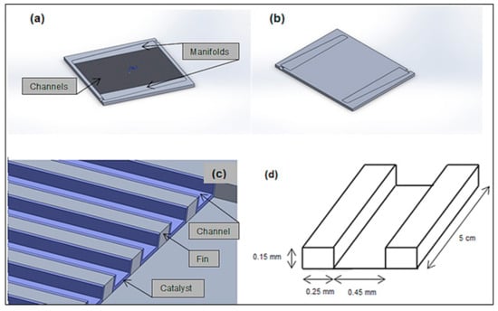 (a) 3D schematic of a platelet containing 80 microchannels and fluid distribution manifoldS; (b) Platelet with manifold only; (c) Enlarged view of the first five microchannels of the platelet (d) Sizes of the microchannel without catalyst layer [6].