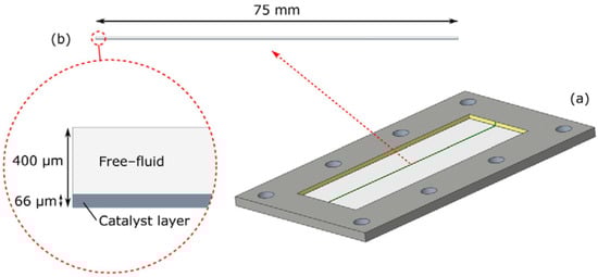 3D schematic diagram of the plate microreactor (a) and distribution of fluid and catalyst (b) [19].