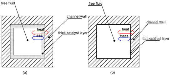 In a microchannel reactor with a thick catalyst layer as shown in Figure 4a, the reaction occurs within the catalyst layer where molecular diffusion must be taken into account. The microchannel is divided into two computational regions, a free fluid domain located in the middle of the channel and a porous media domain located on the wall representing the catalyst layer [21,22]. If the catalyst layer is thin enough as shown in Figure 4b, the reaction is considered to occur only on the channel wall without any internal molecular diffusion effect. The computational region has only one free fluid domain [5]. Other types of microreactors are treated similarly.