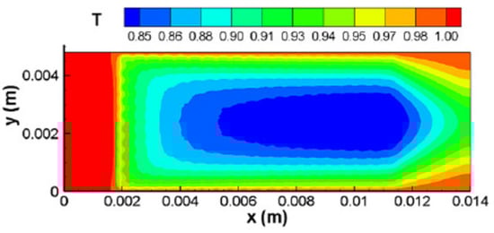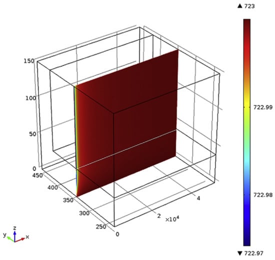 Temperature distribution on the x-z plane of the microchannel reactor at T = 723 K and NH3 flow rate = 500 Nml min−1 [6].