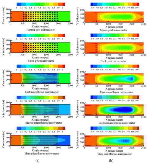 The internal structure of post microreactors can be tailored by adjusting the shapes and arrangements of the internal posts. The post shapes include square, circle, fibrous, etc. The post arrangements include in-line arrangement, staggered arrangement, random arrangement and so on. Among the five post microreactors with different post shapes as shown in Figure 9, the third microfiber reactor outlet has the smallest NH3 partial pressure, and thus it has the largest NH3 conversion, but its internal temperature profile is also the most uneven [20]. The highest NH3 conversion was achieved in the microreactor with a staggered arrangement of catalyst posts, and the worst one was achieved in the microreactor with an in-line arrangement of catalyst posts, while the staggered arrangement led to the largest pressure drop in the reactor. More catalysts fixed at the microreactor wall can obtain higher NH3 conversion [31]. Under a constant catalyst mass, the NH3 conversion increases with the post density, whereas the pressure drop also increases [21].
