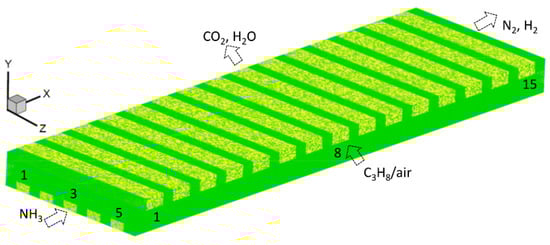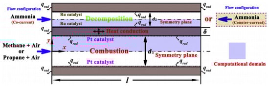 A multifunctional microreactor comprises of a fuel combustion channel and an NH3 decomposition channel separated by a thermal wall. Three processes are combined in the reactor: fuel combustion process, NH3 decomposition process and heat exchange process of the two channels. As shown in Figure 10, the NH3 gas and fuel flow into two channels with catalyst layers on the wall, and the decomposition and combustion reactions occur in the two channels, respectively.