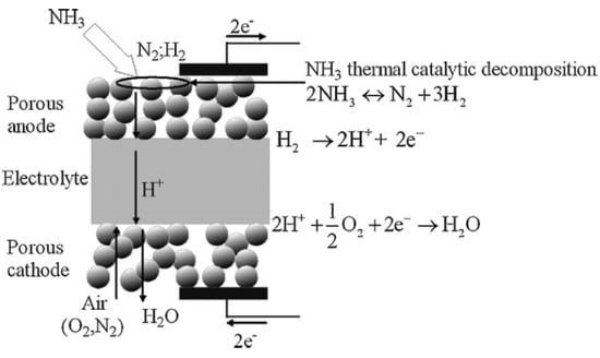 - Ni, M. Thermo-electrochemical modeling of ammonia-fueled solid oxide fuel cells considering ammonia thermal decomposition in the anode. Int. J. Hydrogen Energy 2011, 36, 3153–3166. [Google Scholar] [CrossRef]