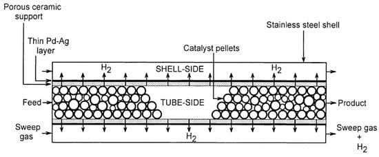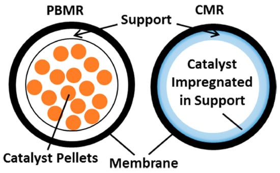 To reduce the limitation of radial diffusion in membrane reactors, Zhang et al. [60] developed a catalytic membrane reactor (CMR). As Figure 16 shows, the catalyst layer is adjacent to the membrane in the CMR and H2 is released directly near the permeable membrane during decomposition while the catalyst pellets are dispersed in the channel of the packed-bed membrane reactors (PBMR). Therefore, the diffusion scale of H2 in the CMR is micron-sized while it is millimeter-sized in the PBMR. As a result, the CMR exhibited less amount of catalyst, lower operating temperatures and higher H2 yield than the PBMR.
