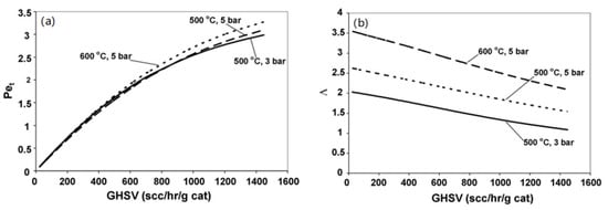 Dependence of Pet number (a) and Λ number (b) on GHSV under different working conditions [58]. GHSV denotes the gas hourly space velocity; cat denotes the catalyst.