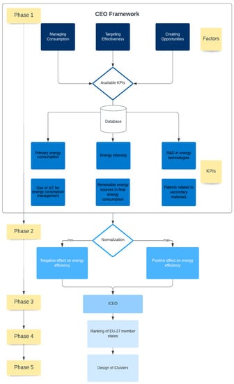 The three factors of the CEO framework were considered equally important, as the best results will be obtained by considering managing consumption, targeting effectiveness, and creating opportunities in synergy. The three factors, regardless of the number of KPIs considered, must consider the reconciliation of the needs of society in terms of energy consumption with sustainable economic growth. In this way, the current model moves away from the dominant global economic paradigm and does not subordinate energy efficiency to economic growth at all costs. The study was restricted to the best few available KPIs which avoided redundancy, overcrowding, and difficulty in application. The method identifies a single number (ICEO composite index) which captures the six included KPIs to synergically render an energy-efficiency ranking of each country belonging to the EU-27 space. The ICEO encapsulates the multi-dimensional concepts introduced by KPIs, different in meaning and units, allowing a ranking of EU-27 member states.