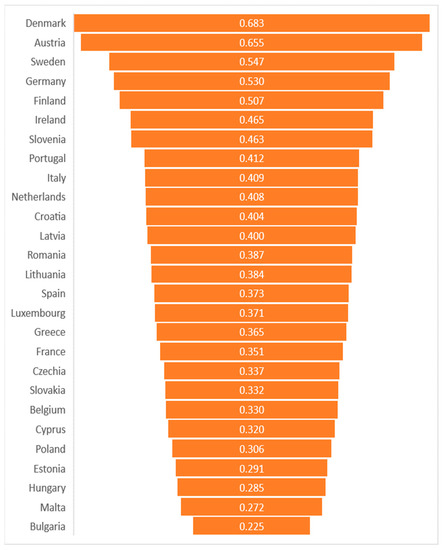 The values of the ICEO indicate that all EU-27 member states need to improve their energy systems. The average value of the ICEO was 0.400, less than half of the theoretical maximum of 1.00. Even the leading countries are far from the theoretical maximum value, except Denmark, which is the best performing country. The gap from the leader country, which is Denmark, varies from 4% (to the second country) to 204% (to the last country), showing that many countries lag behind and have an acute need for improvement.