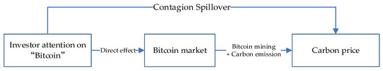 Bitcoin, one of the most popular cryptocurrencies, becomes a research focus in recent years [4,5]. While researchers are obsessed with price of Bitcoin, few researchers paid attention to the huge electricity consumptions and carbon emissions behind Bitcoin until Jiang et al. [6]. On the one hand, huge excess return prompts Bitcoin trading and Bitcoin mining, resulting the demand for electricity and carbon emission to change drastically. Consequently, the carbon price is affected. On the other hand, Zhu et al. points out that investor attention on Bitcoin will affect the Bitcoin market [4]. The two aspects motivate the authors to link the Bitcoin attention and carbon price in the following theoretical framework (see Figure 1). However, current investigations have not involved in this field. Thus, in this paper, we focus on Bitcoin attention and carbon return in order to fill the potential research gap. As market explaining and forecasting stand the focus of pricing theory. In this paper, we try to explain and forecast the carbon return by Bitcoin attention.