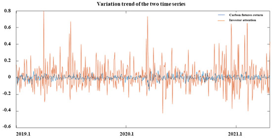 where refers to the carbon futures return, represents Bitcoin attention. represents the time lag of the corresponding variable. Granger causality is used to test whether another variable is the Granger cause of one variable and is closely related with the VAR model. Specifically, it is used to test whether or () is jointly equal to 0. In this paper, whether () is statistically equal to 0 in Equation (1) is of interest as it reflects the impacts of Bitcoin attention on carbon futures return. In other words, we are interested in whether contagion spillover of investor attention from one market to a totally different market exists.
