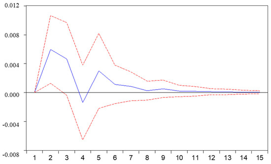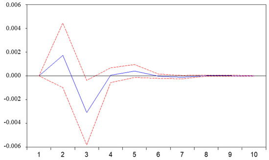 Obviously, Bitcoin attention does Granger cause the carbon futures return. Furthermore, Bitcoin attention is significantly and negatively connected with the carbon futures returns as the terms of , , and are significantly negative. These results demonstrate that contagion spillover of investor attention from one market, i.e., the Bitcoin market, to a totally different market does exist, i.e., the carbon futures market. The impulse response function (IRF) allows researchers to analyze the duration of shock from one variable to another variable under the framework of VAR modelling. In this section, to comprehensively analyze the contagion spillover of investor attention from one market to a totally different financial market, IRF is implemented, and Figure 4 summarizes the IRF. As shown in Figure 4, Bitcoin attention surely affects the carbon futures return, and one unit shock from Bitcoin attention may last for seven days in the carbon futures market. However, all the above-mentioned analyses are derived based on the VAR analysis, so the effects of Bitcoin attention on carbon futures deserve in-depth discussions.