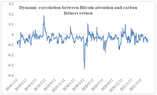 Previous empirical investigations show an interesting reality that Bitcoin attention exerts a negative impact on carbon futures return. In other words, Bitcoin attention and carbon futures returns are negatively connected. However, the results are obtained based on some linear model specifications. In this subsection, we update the model specification to re-investigate the connections between Bitcoin attention and carbon futures. The VAR-DCC-GARCH model is a widely used model and can depict correlations between variables [57]. Thus, in this sub-section, we adopt the model and estimate the dynamic correlation between Bitcoin attention and carbon futures return for robustness check. According to the results in the sub-section of 5.1, the lag length in the VAR model is 4. At the same time, according to Ustaoğlu, DCC-GARCH (1, 1) is enough to capture the correlations between variables [57]. Thus, in this sub-section, we construct the VAR (4)-DCC-GARCH (1,1) model. Basic information about the dynamic correlation is shown in the following Figure 5 and Table 14. As shown in Table 14, Bitcoin attention and carbon futures returns are negatively connected, as the mean value of the dynamic correlation is −0.0330. The results are consistent with the all the previous estimations. Our conclusion on the negative impact still holds.