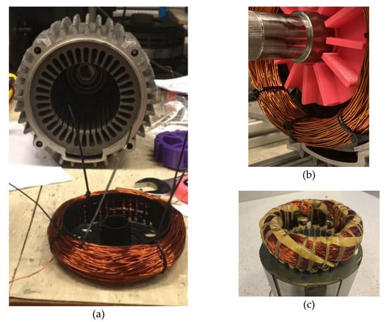 (a) Coil for representation of the end winding and the stator of 4 kW benchmark induction motor; (b) assembled experimental model; (c) end winding of an electrical machine.