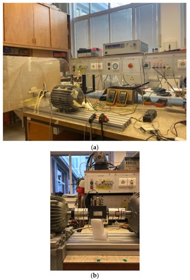 The constructed test rig consisted of a completely enclosed motor housing with the coil inside (experimental model), which was positioned and fixed on a measuring slot aluminum extrusion profile. The profile was placed on top of the laboratory table and it was well-attached to it (Figure 2a). The rotation of the shaft was provided by an induction drive motor, controlled with the variable-speed inverter with a rated power of 7.5 kW. The rotating shaft of the experimental model and the rotor of the drive motor were mechanically coupled via a torque sensor with a capacity of 10 Nm (Figure 2b). Due to the airflow, caused by the drive motor (TEFC—Totally Enclosed Fan Cooled type), an additional cardboard barrier had to be placed in-between in order to block the air flow along the shaft axis, which would have affected the thermal conditions and measurements. For the purpose of studying the blade configuration influence on the air flow in the end-winding region, different plastic (PLA—Poly Lactic Acid thermoplastic polymer) ventilation fans with blades were constructed and 3D-printed (Figure 3a).