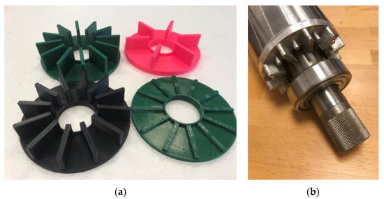 (a) Three-dimensionally printed ventilation fans with different blade configurations; (b) die casted blades as an integral part of the rotor end ring of an induction machine.