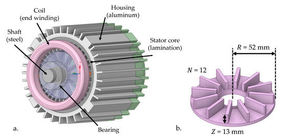 The 3D CFD numerical model was built according to the dimensions of the experimental model components using the Ansys Fluent 19.3R software package. The geometry of the 3D model and ventilation fan model is shown in Figure 5a,b, respectively. The blades of the ventilation fan stretch from the shaft to the outer radius of the fan , which is equal to the outer rotor radius. The shaft radius is related to the outer rotor radius (Table 4 and Figure 5) according to the standard IEC 60072 (Rotating electrical machines—Dimensions and output series). In order to reduce computational time, the coil representing the end winding was simplified and modeled with a toroid. The axial length of the stator core in the model was shortened (dimension in Figure 6 and Table 4), as it had negligible effect on the thermal behavior in the end-winding region due to thermal insulation and low thermal conductivity in the axial direction (Table 5).