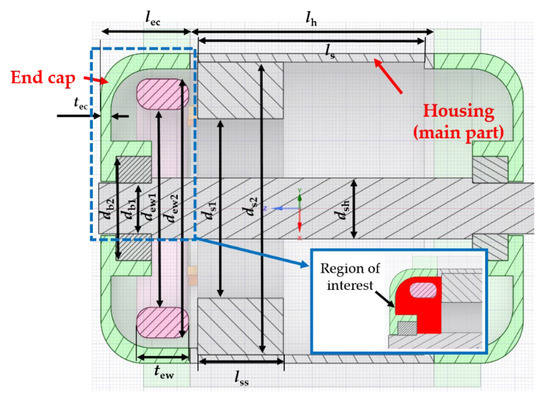 Figure 6 shows the cross-sectional view of the CFD model with the geometric parameters explained in Table 4. The region of interest, where the physical phenomena were analyzed in detail, is colored in red (zoomed area in Figure 6). The material properties assigned to the modeled components are given in Table 5. The thermal conductivities of the end winding and stator core are anisotropic; thus, there are three different values given in Table 5, referring to the thermal conductivity in radial, circumferential, and axial directions (, , ).