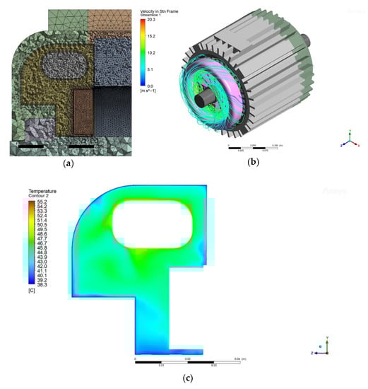 The accuracy of the CFD numerical simulations depends on the physical properties of the model; thus, the mesh density was manually adjusted for each region. A fine mesh must be used for the contact area between the solid components (e.g., coil and end cap) and the air in the end-winding region (fluid) in order to accurately model the air velocity and the temperature distribution. For this purpose, 5 inflation layers were added to the mesh at the boundaries of the air domain (Figure 7a). Solid components with good thermal conductivity (metals) can have larger elements, i.e., tetrahedron cells, while smaller cells have to be used for the air domains. The maximum cell size for the mesh of the solid objects was set to 9 mm. The cell sizes in the moving and stationary air domain were set to 1 mm and 2 mm, respectively. The total number of elements in the CFD model was 5.3 million, resulting in an average computational time of approximately 14 h per one CFD simulation. A result, showing the air velocity streamlines in the end-winding region, is presented in Figure 7b, and the temperature distribution in the region of interest is shown in Figure 7c.