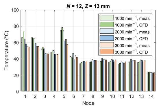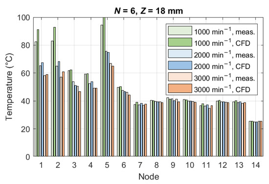 In order to validate the CFD model, the comparison of temperature distribution was made. In Figure 8, the measured and calculated temperatures are shown for the ventilation fan with = 6 blades with a = 18 mm height at three different rotational speeds. Figure 9 shows the temperature distribution for the configuration = 12 and = 13 mm. Matching of the temperatures serves as a proof of correct behavior of the CFD model. A complete set of validation bar charts can be found in the Supplementary Material to the paper.