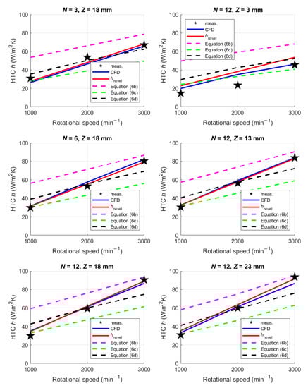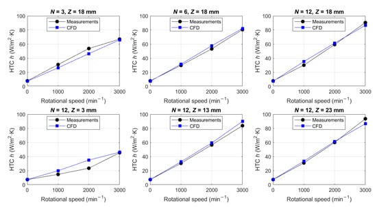 In Figure 10, the HTC relation to the rotational speed , , is shown for six different blade configurations, i.e., = {3, 6, 12} at = 18 mm and = {3 mm, 13 mm, 23 mm} at = 12, with all numerical values collected in Table 7 (in the Section 3.3 Discussion). Good matching of the measurement and CFD results in all graphs is a proof of a well-calibrated CFD model. Thus, the CFD model was used for all further investigations regarding the convective heat transfer in the end-winding region.